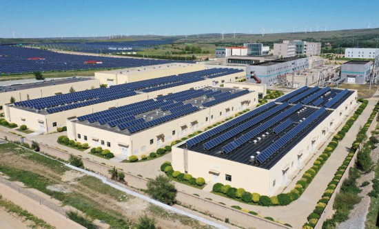 在河北张家口,国家风光储输示范工程内数排储能厂房并列其中。(2023年8月18日摄,无人机照片)。新华社记者李贺 摄