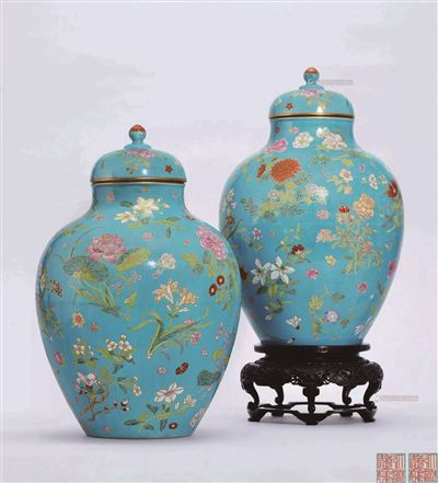 清乾隆 松石绿地洋彩描金折枝四季花卉纹盖罐成对